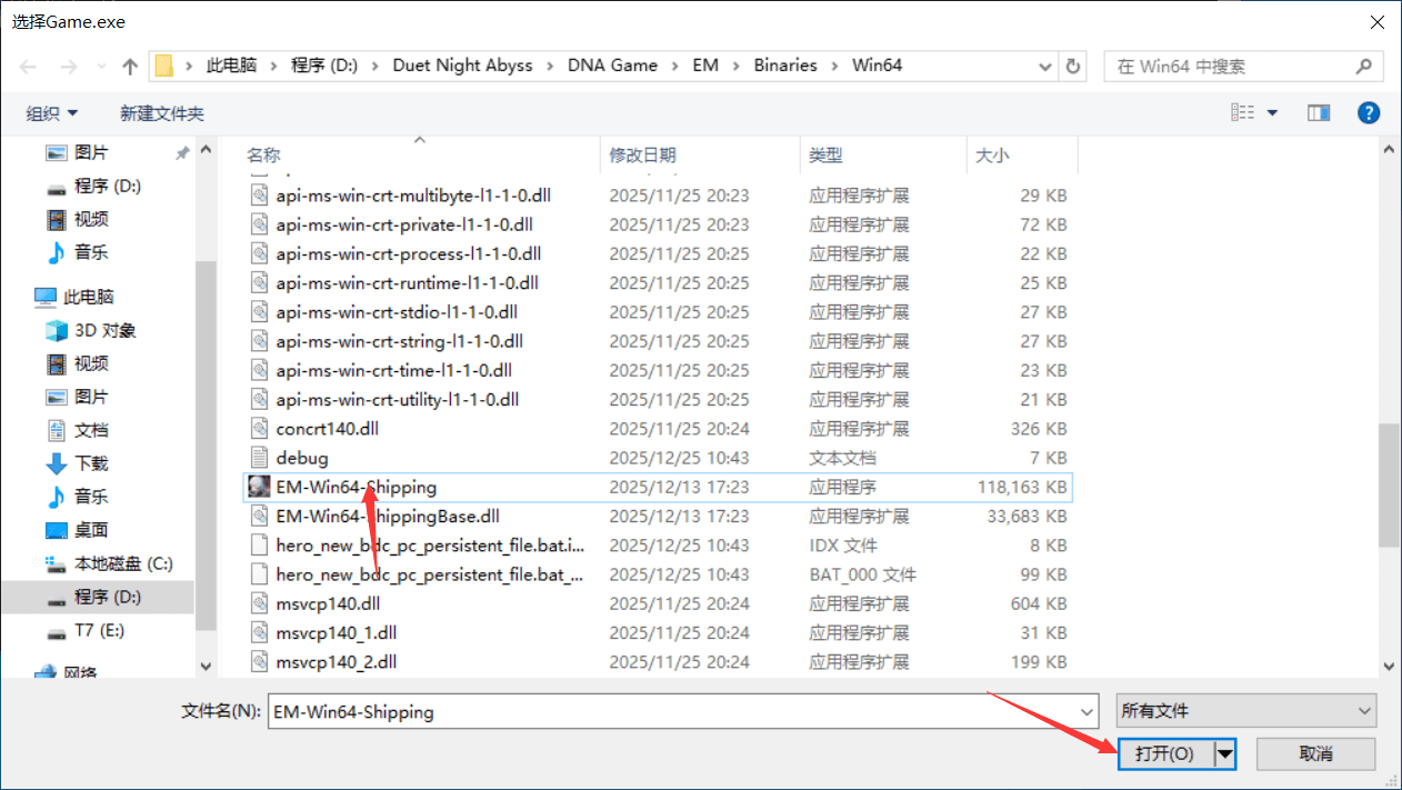 2.选择游戏文件,路径例如:D:\Duet Night Abyss\DNA Game\EM\Binaries\Win64\EM-Win64-Shipping.exe,如下图: